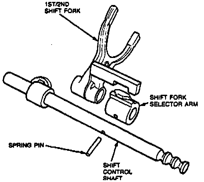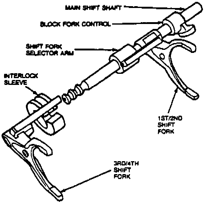 2. Rotate 1st-2nd shift fork until notch in fork is positioned over selector arm finger. Slide 3rd and 4th fork and interlock sleeve off shaft.