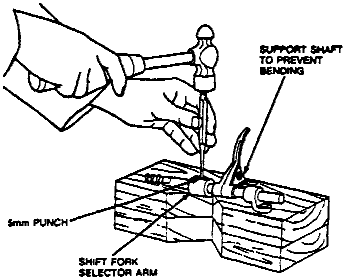4. Remove fork control spring pin, using a 5 mm punch, then the fork control block from the shift control shaft.