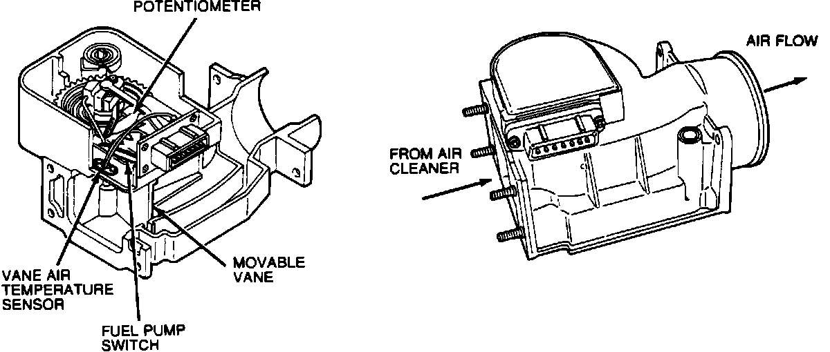 The VAF meter contains a potentiometer connected to a movable vane. Inside the VAF meter is a fuel pump switch providing a ground for the fuel pump circuit after the engine has started. The meter also contains an Intake Air Temperature (IAT) sensor which monitors and relays inlet air temperature to the PCM.