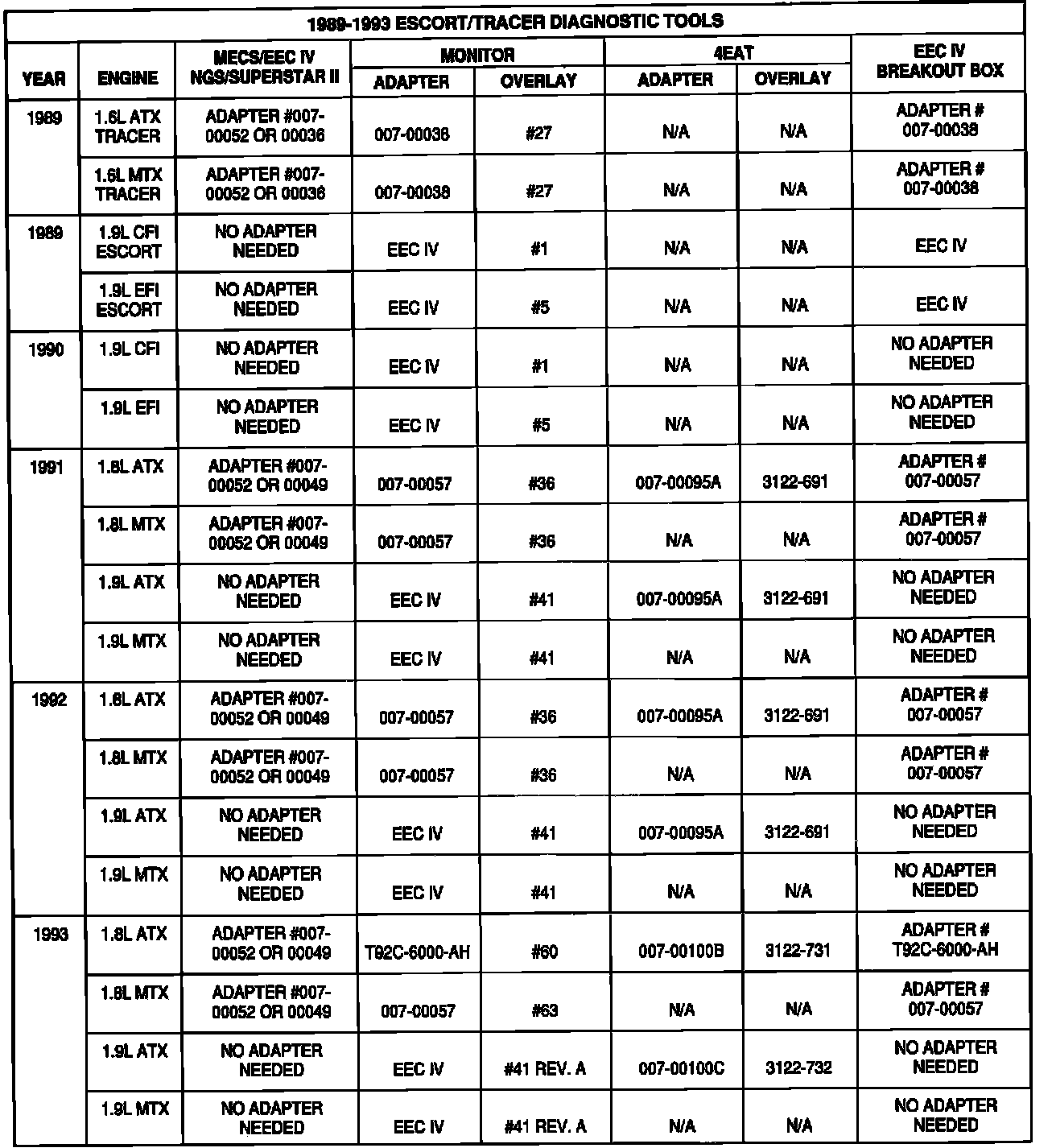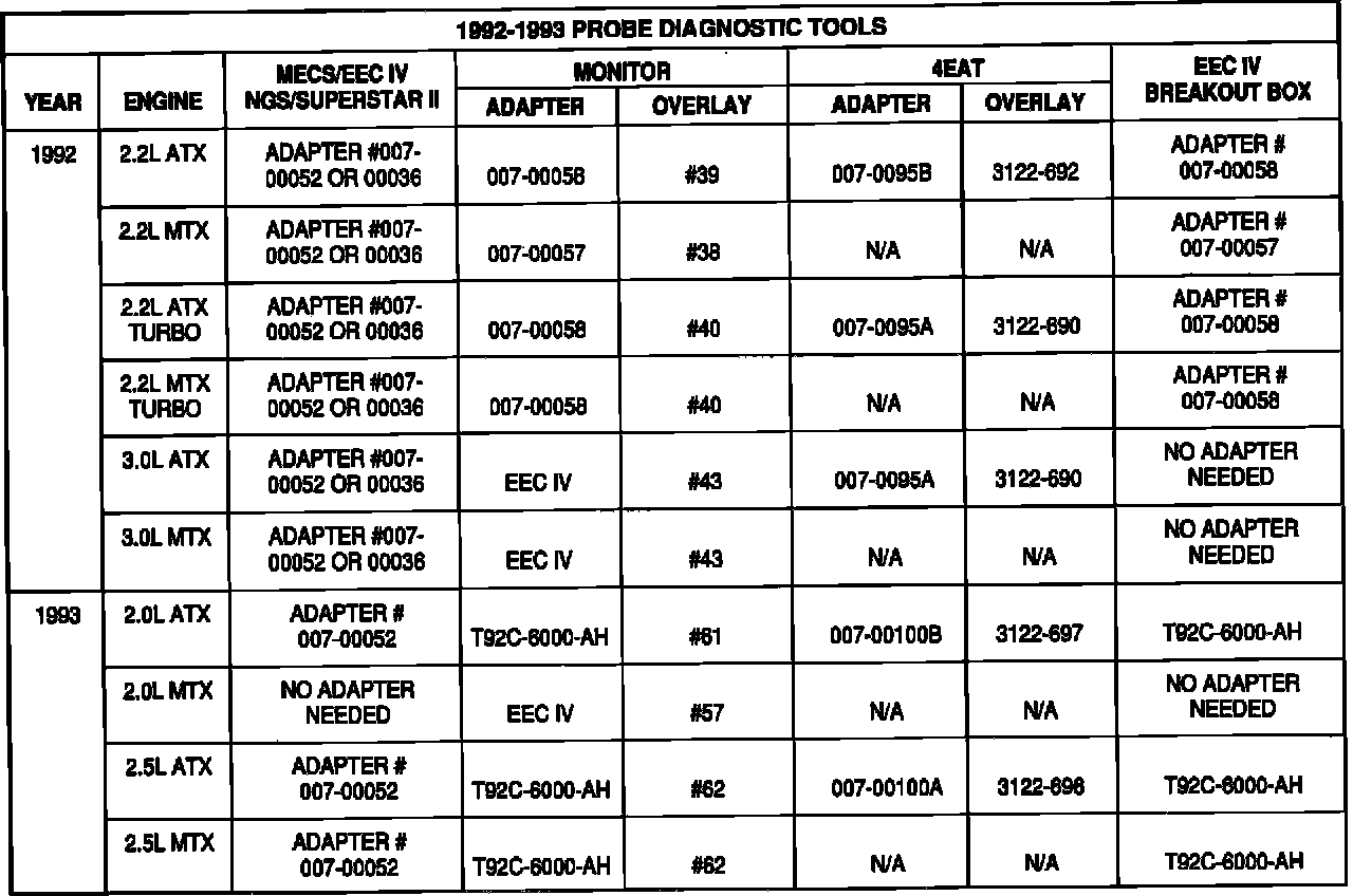 The diagnostic tools and breakout box adapter applications for the vehicles listed above are not easily found in the Service or Powertrain Control/Emissions Diagnosis Manuals.