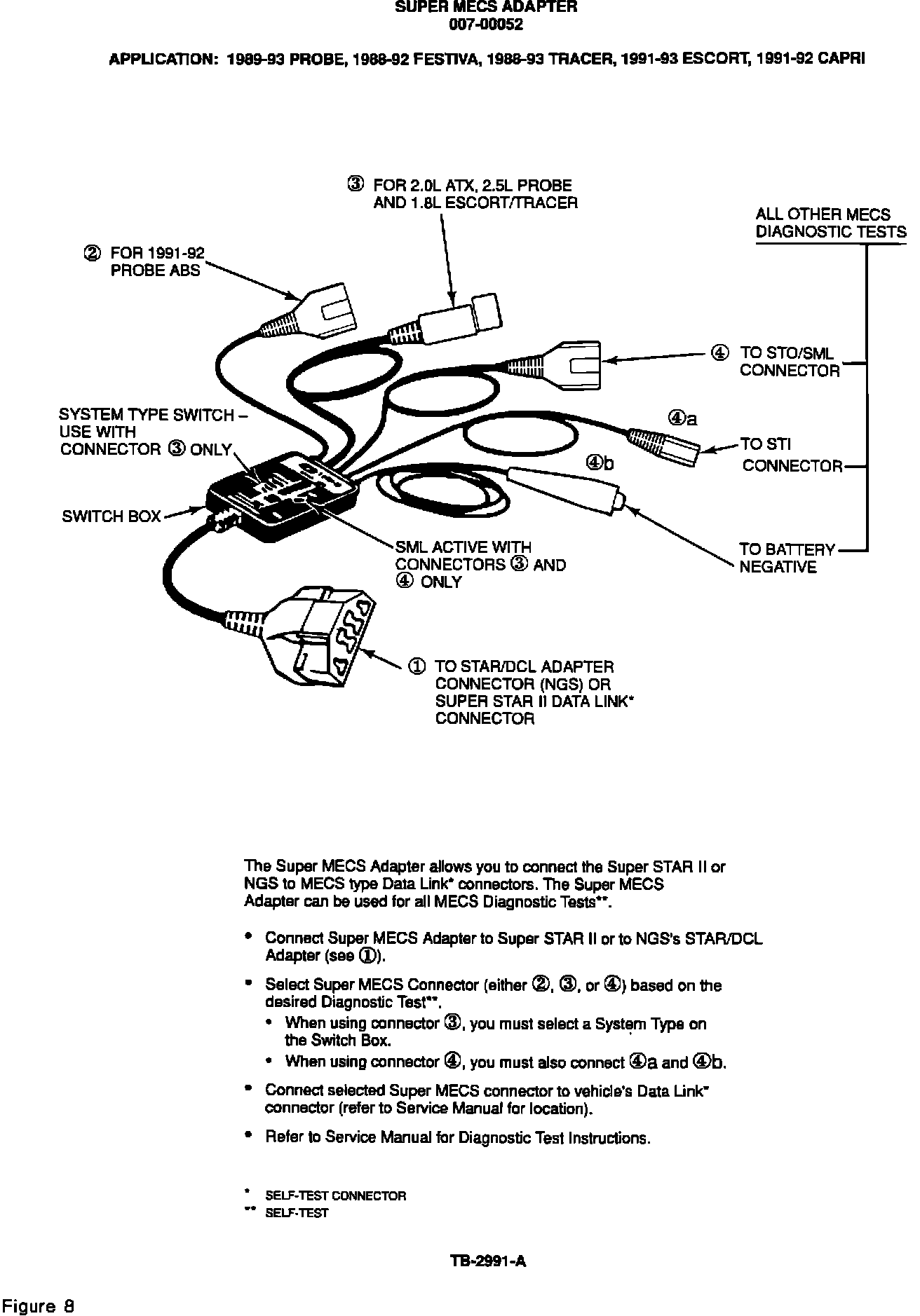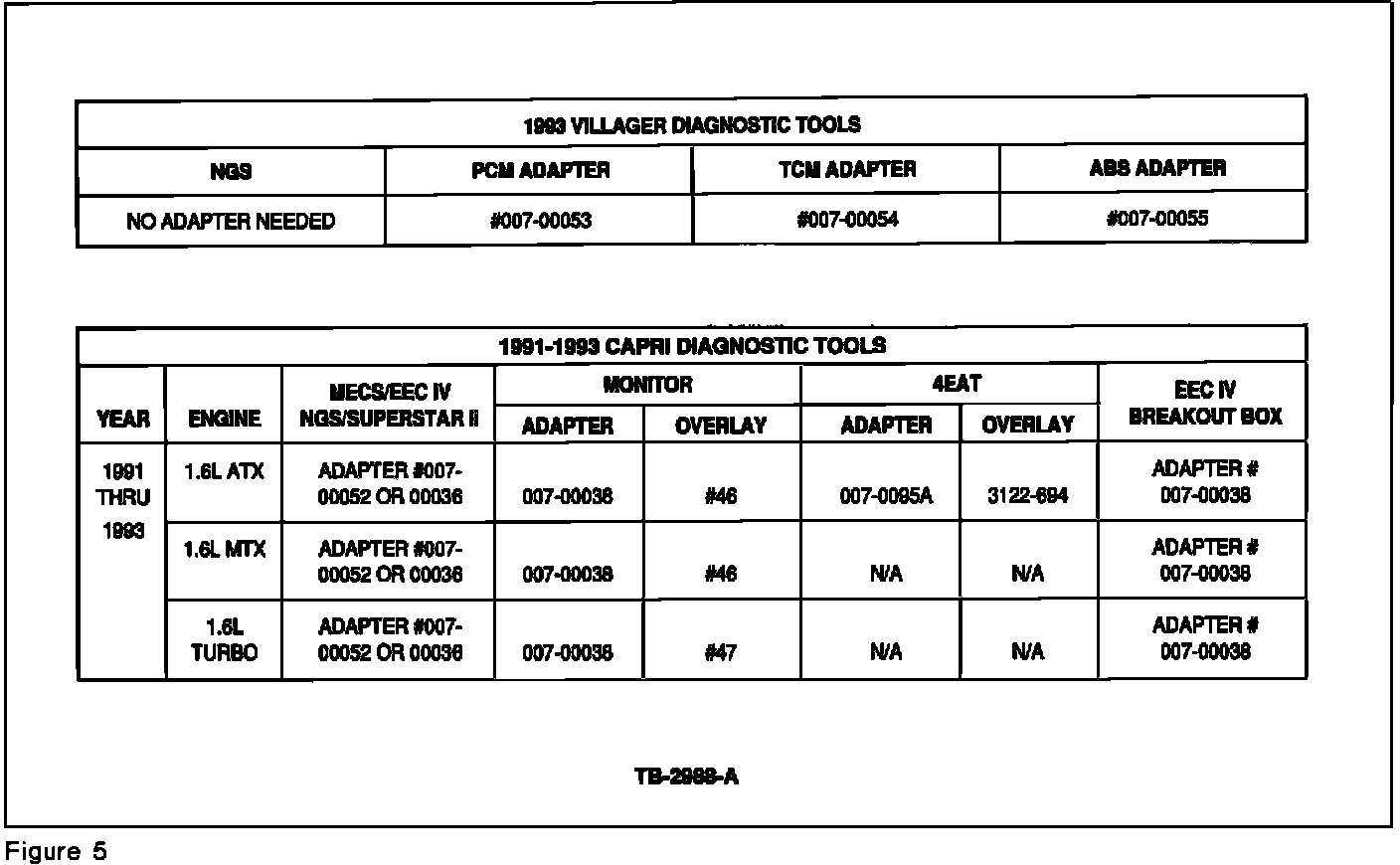 Refer to Figures 1-5 for a list of the diagnostic tool applications listing the model, year and engine transaxle combinations. Refer to Figures 6-11 for descriptions and instructions for connecting various breakout box adapters.