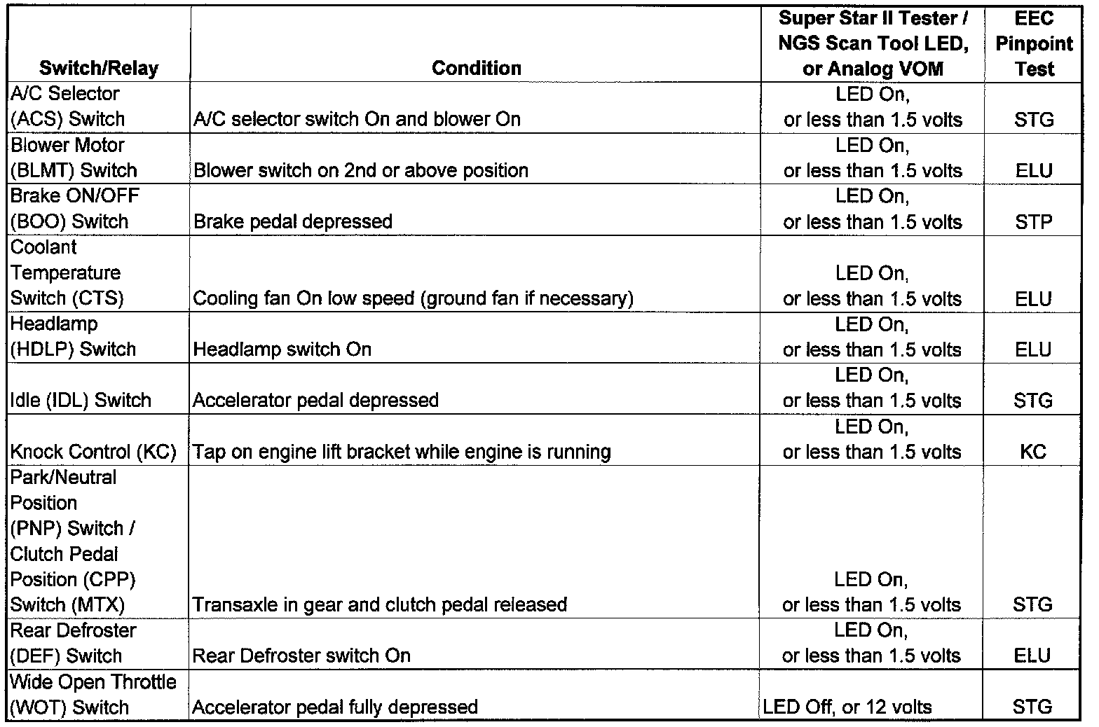 NOTE: Test all switches individually. Leaving a switch ON while testing another will lead to a false test result.1. Turn engine OFF, and allow to cool.