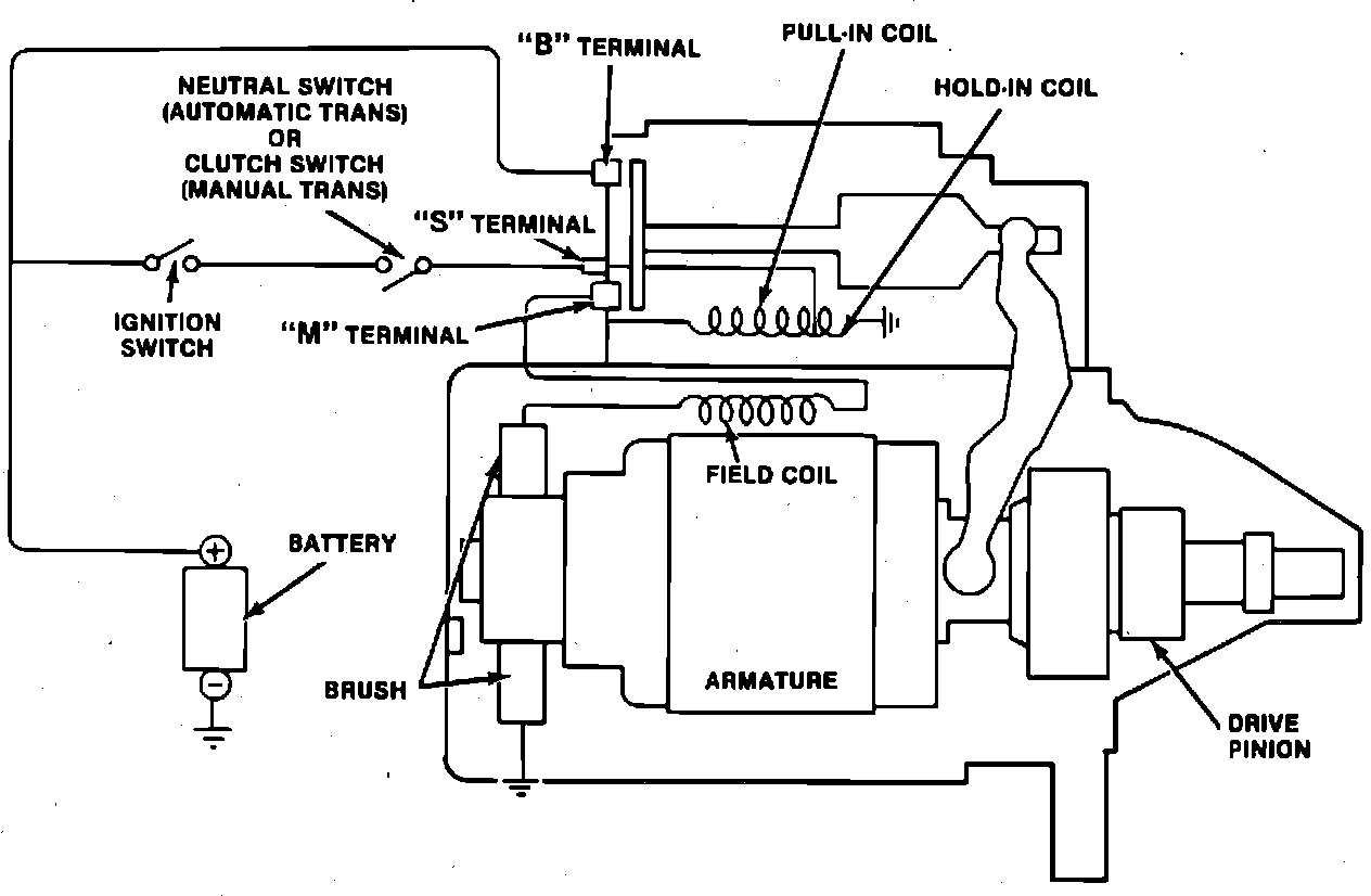 This starter system has two electrical circuits; a low current and a high current. The low current is the control circuit. It includes ignition switch, starter solenoid, neutral safety switch or clutch switch. The high current connects starter to the battery positive terminal. This circuit uses heavy gauge cables because of high current flow required to operate the starter motor, Fig. 1.