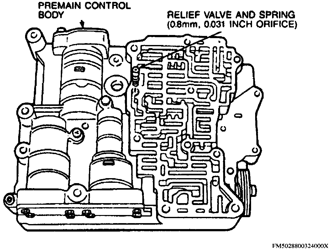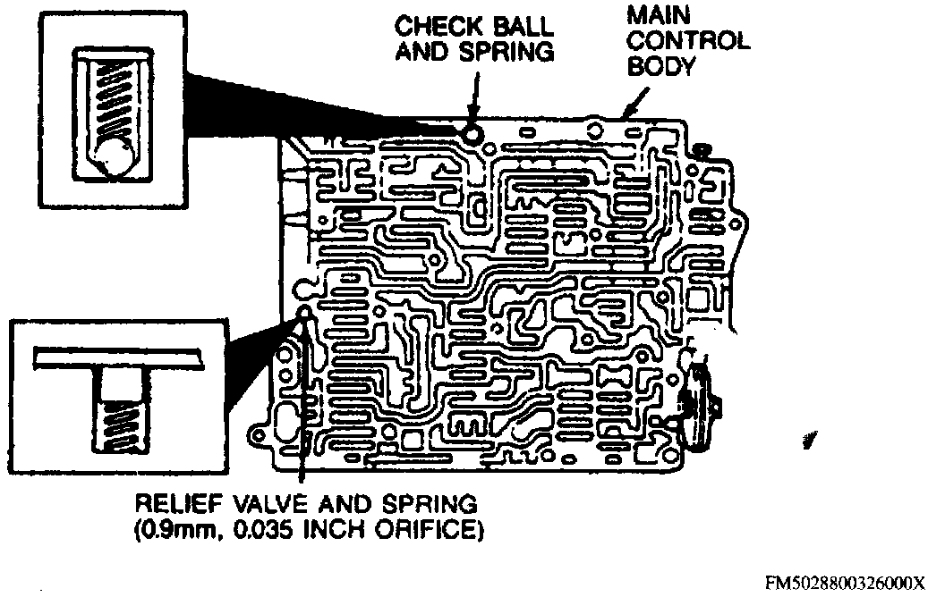 10. Remove converter relief ball, spring, orifice check valves, and spring from main control body.