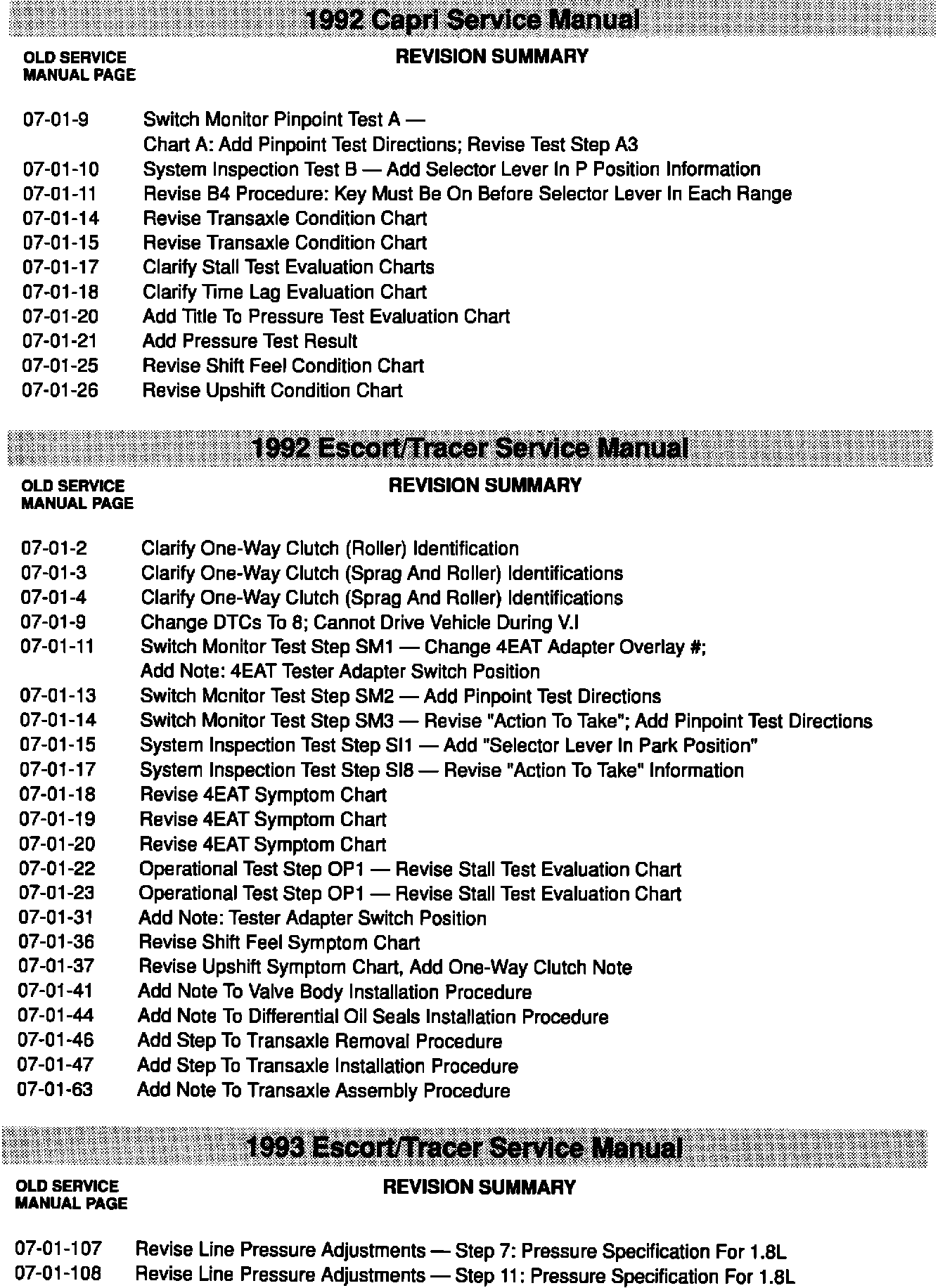 The 1992 Capri, 1992 and 1993 Escort/Tracer, and 1992 Probe Service Manuals contain 4EAT diagnostic information which requires revision. The following pages are affected: