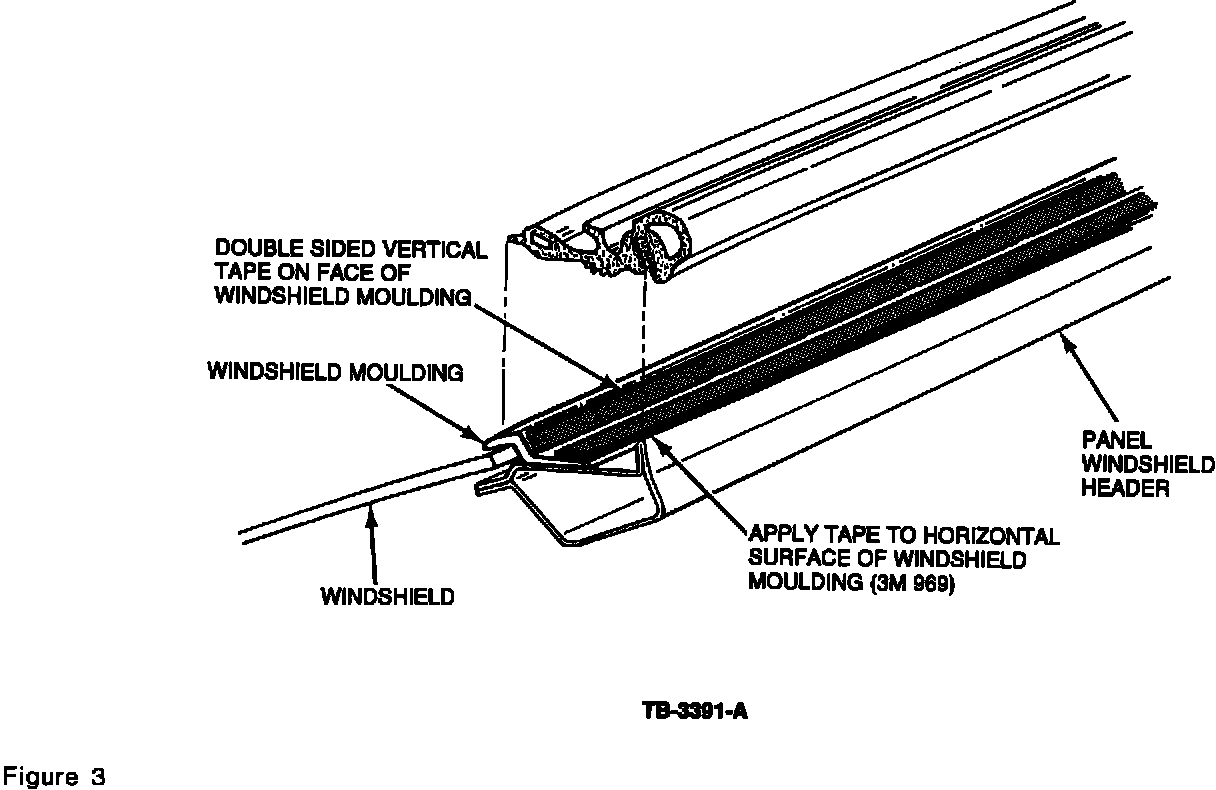 5. Apply a strip of 3M Brand "969" adhesive tape (FOJY-76514-A46A, or equivalent) along the length of the horizontal face of the windshield upper moulding. Do not peel the backing paper from the tape, Figure 3.