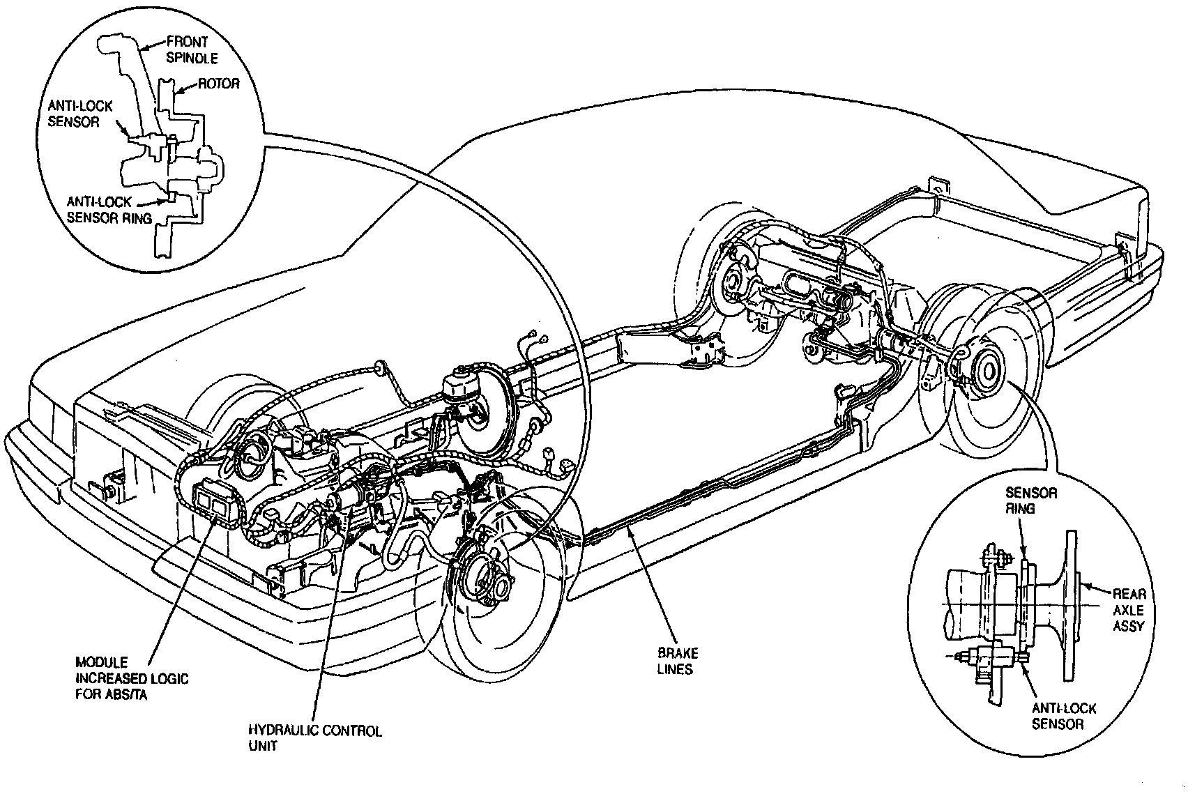 The anti-lock system (ABS), Fig. 1, controls each brake separately. The brake pedal force required to engage the system function may vary with road surface conditions. A dry surface will require a higher force, while a slippery surface will require a much less force. During system operation, the driver will sense a slight pulsation in brake pedal accompanied by a rise in brake pedal height and a clicking sound. The pedal effort and pedal feel during normal braking are similar to a conventional power brake system.