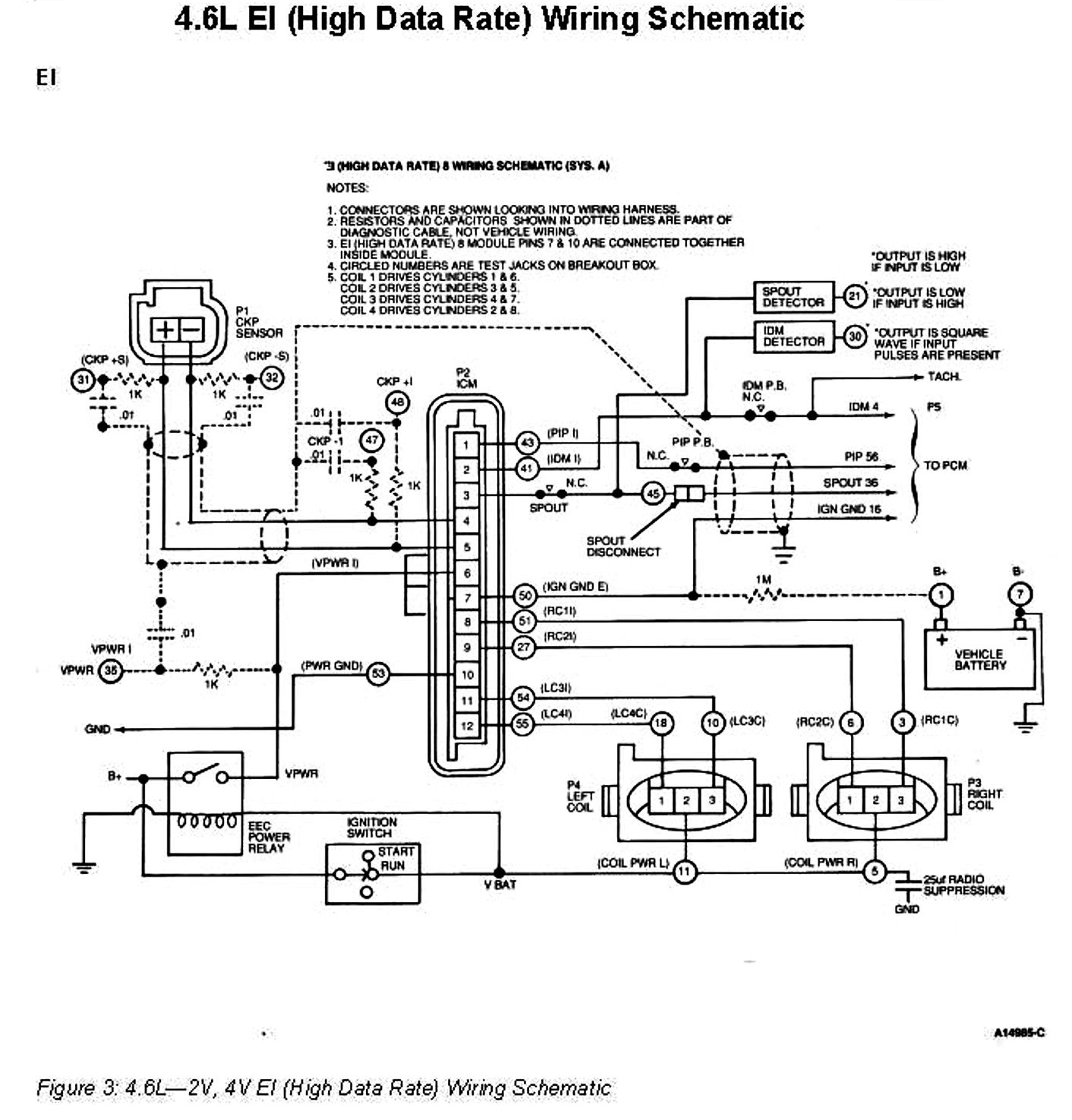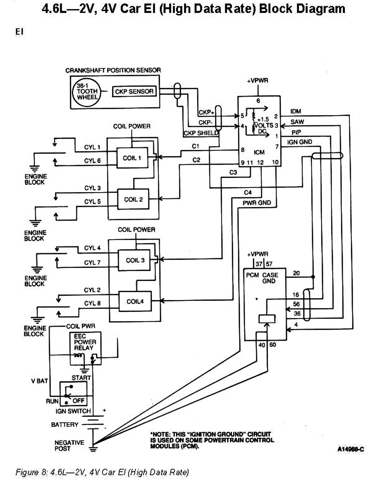 The 4.6L EI (High Data Rate) System consists of a Crankshaft Position (CKP) (variable reluctance) sensor, an Ignition Control Module (ICM), a Powertrain Control Module (PCM), and two four-tower Coil Packs.