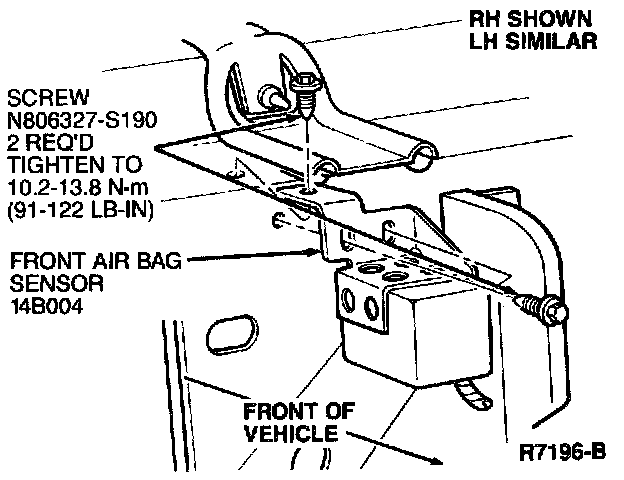 1. Position RH or LH front sensor and wire lead in vehicle and secure sensor to RH or LH side of radiator support with retaining screws. Tighten screws to 10.2-13.8 Nm (91-122 in lbs).