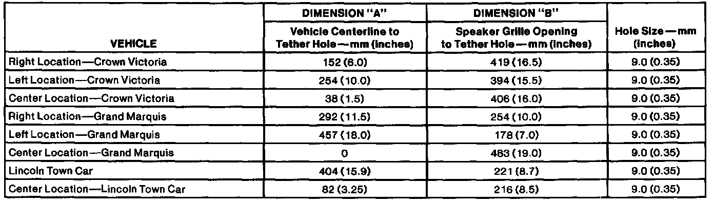 Dimension B is the approximate distance from the center of the radio speaker grille opening to the center of the tether attachment holes.