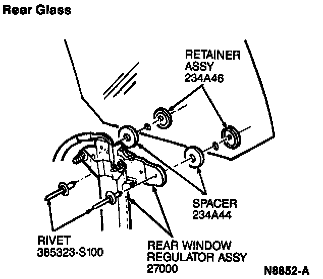 Prior to removing the rivet center pins, it is recommended that a suitable block support be placed between the door outer panel and the glass bracket to stabilize the glass during rivet removal.
