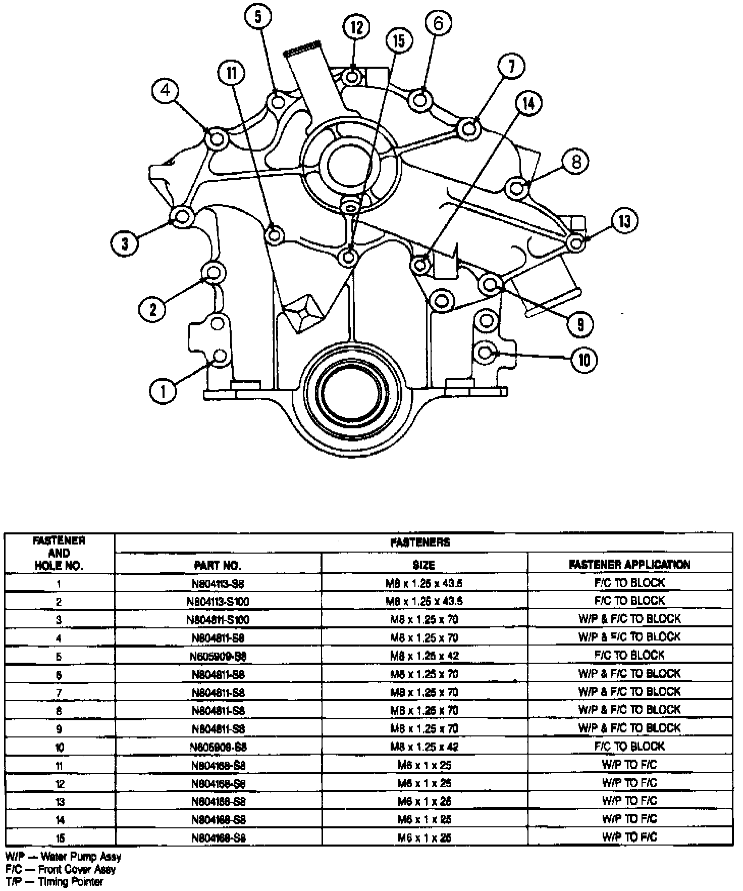 7. Remove timing cover to block retaining bolts. Timing cover and water pump may be removed as an assembly by not removing bolts Nos. 11-15.