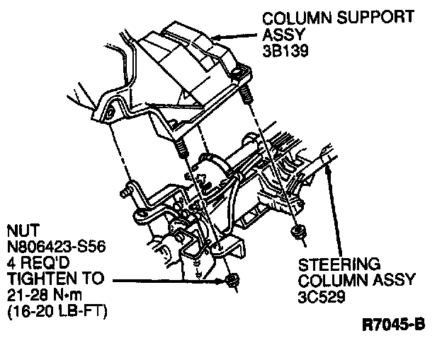 9. Remove four nuts retaining steering column to support, disconnect PRNDL cable (column shift) and lower column on front seat. Cover front seat to protect from damage.