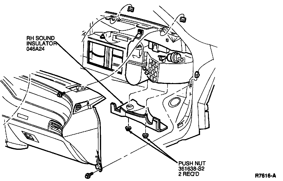 14. Remove sound insulator under glove compartment by removing two pushnuts that secure insulator to studs on climate control case.