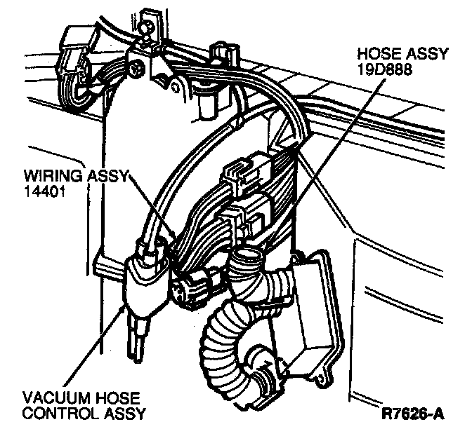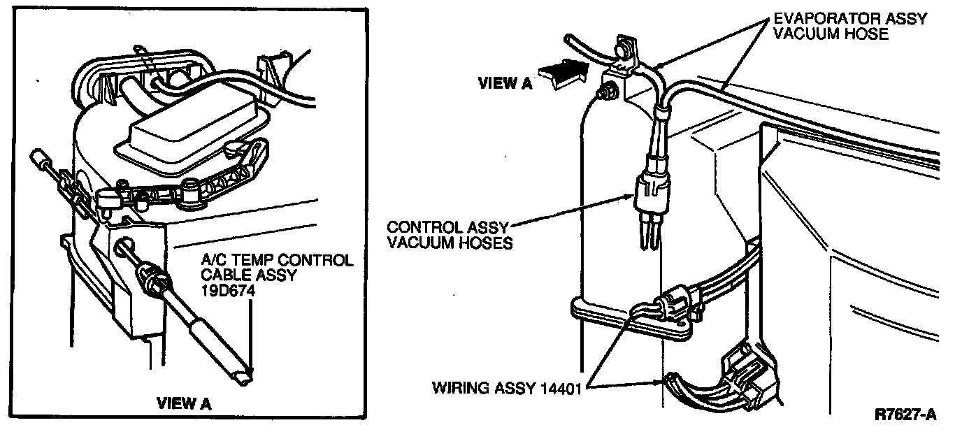 23. Using steering column and glove compartment openings and by reaching under instrument panel, disconnect all electrical connections, vacuum hoses, heater-A/C control cables and radio antenna cable.
