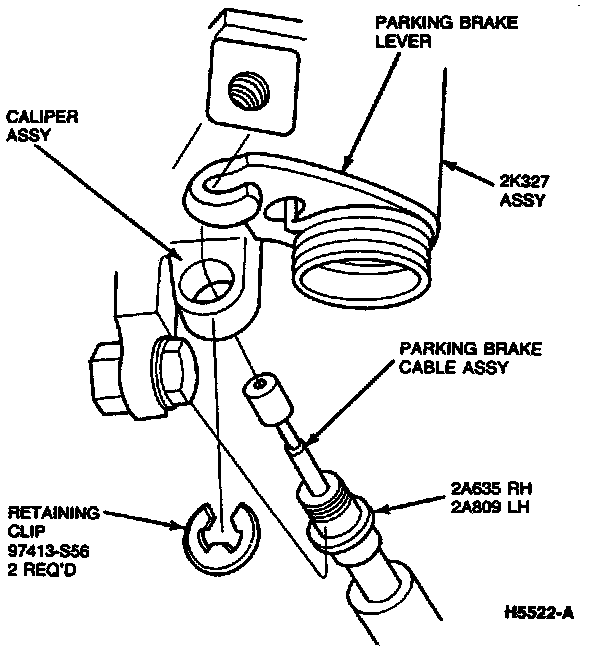 5. Attach cable end to parking brake lever. Install cable retaining clip on caliper assembly.