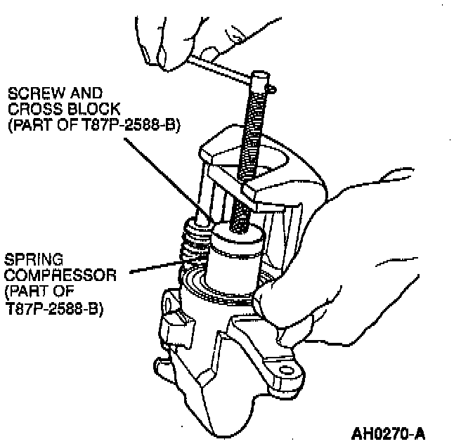 9. Position spring compressor and screw and crossblock on push rod, and lightly screw tool clockwise to compress spring. Install snap ring.