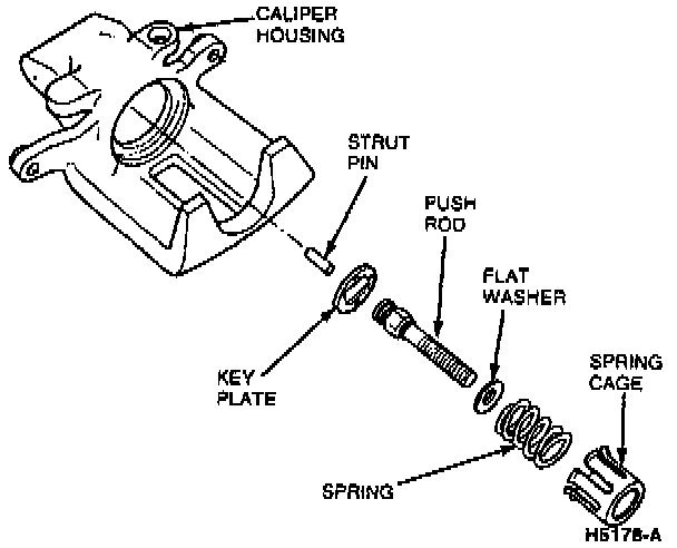 7. Remove spring cover, RH anti-rattle spring cover, washer, key plate and pull out push rod and strut pin from caliper bore.