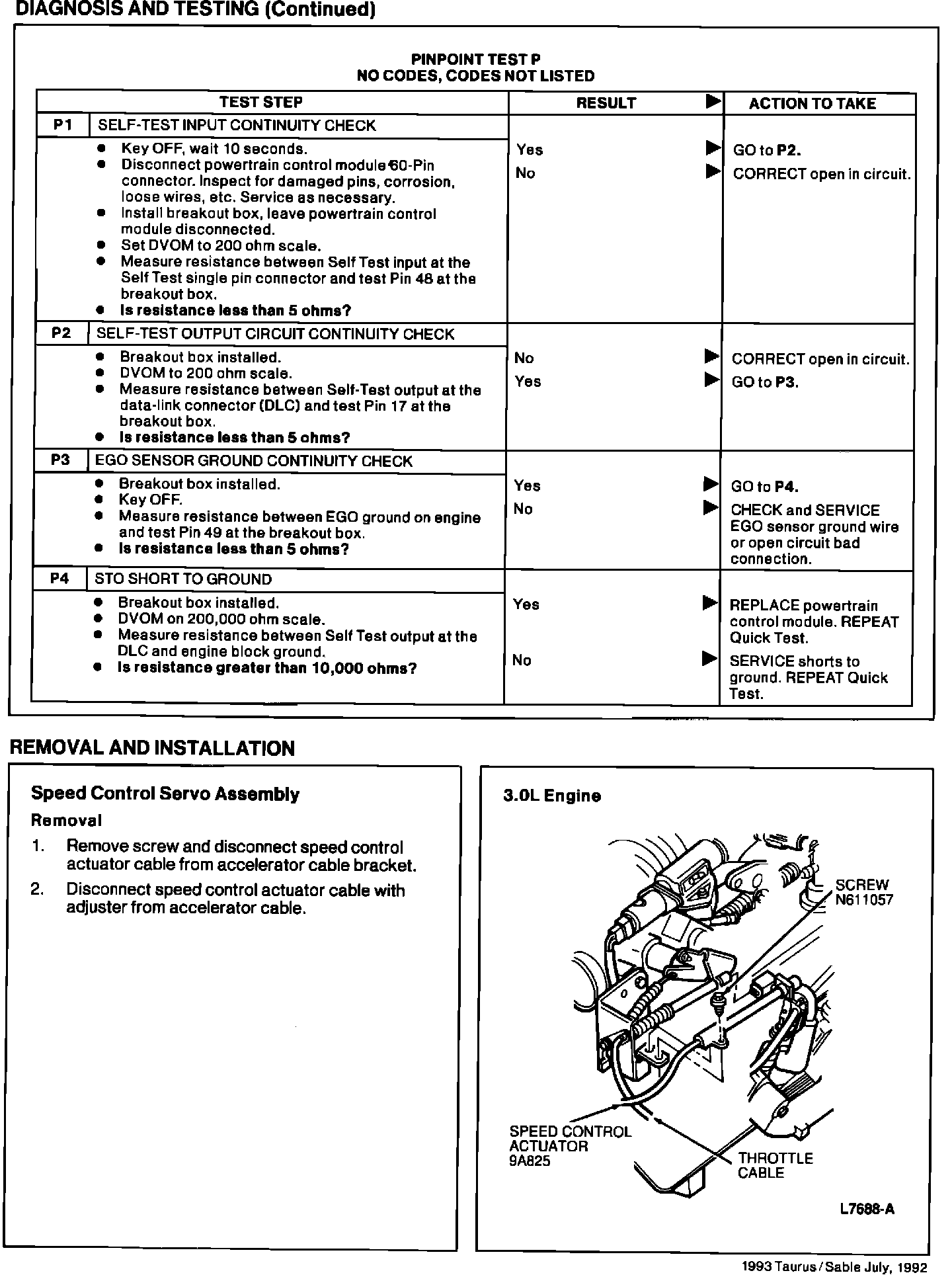 Speed Control System diagnostic information requires revision. Page 10-03-21 of the 1992 Taurus/Sable Service Manual, and Pages 10-03A-25 and 10-03A-32 of the 1993 Taurus/Sable Service Manual, are affected.