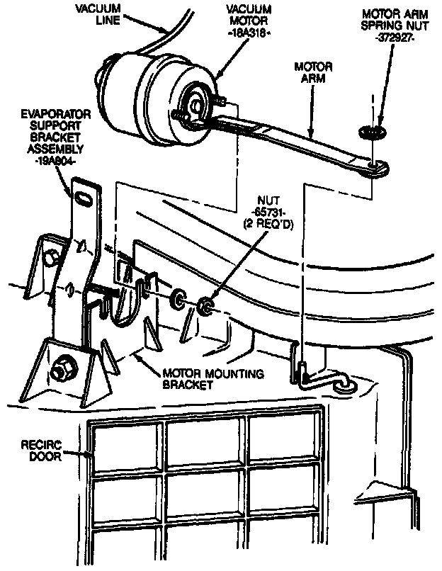 1. Position the vacuum motor to the outside-recirculating door crank arm. Position the motor to the recirculating duct and install the two retaining nuts.