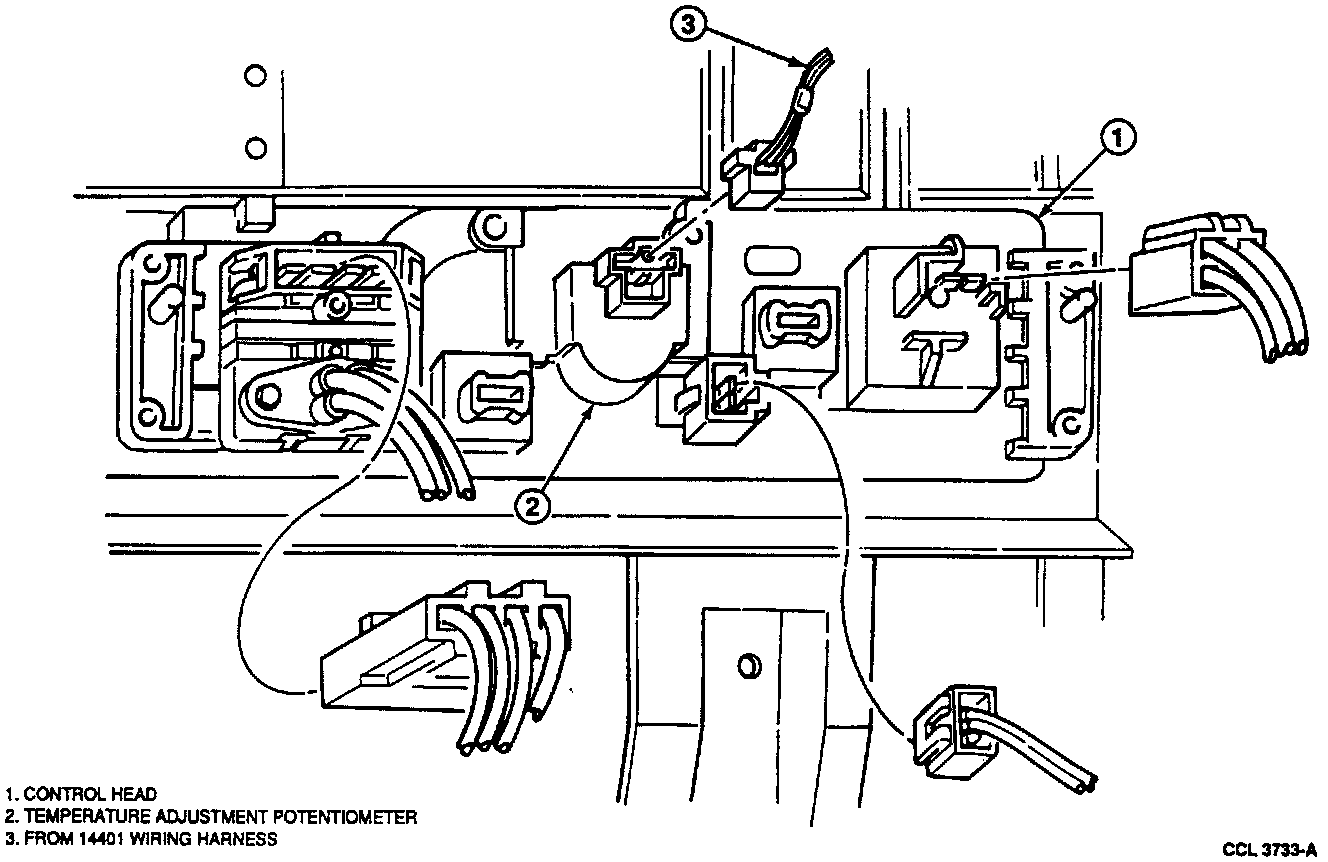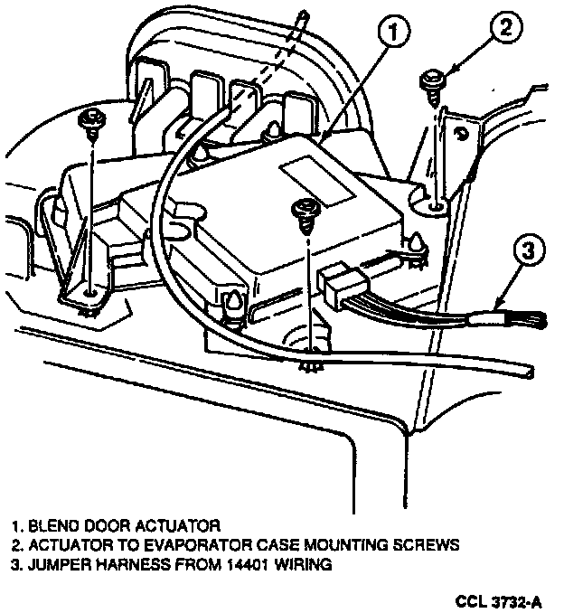 3. The temperature control knob (temperature adjustment potentiometer) which connects through an A/C electronic door actuator motor to the A/C air temperature control door of the heater air plenum chamber assembly by an A/C electronic door actuator motor. Movement of the control knob from COOL to WARM causes a corresponding movement on the A/C air temperature control door and determines the temperature that the system will maintain.