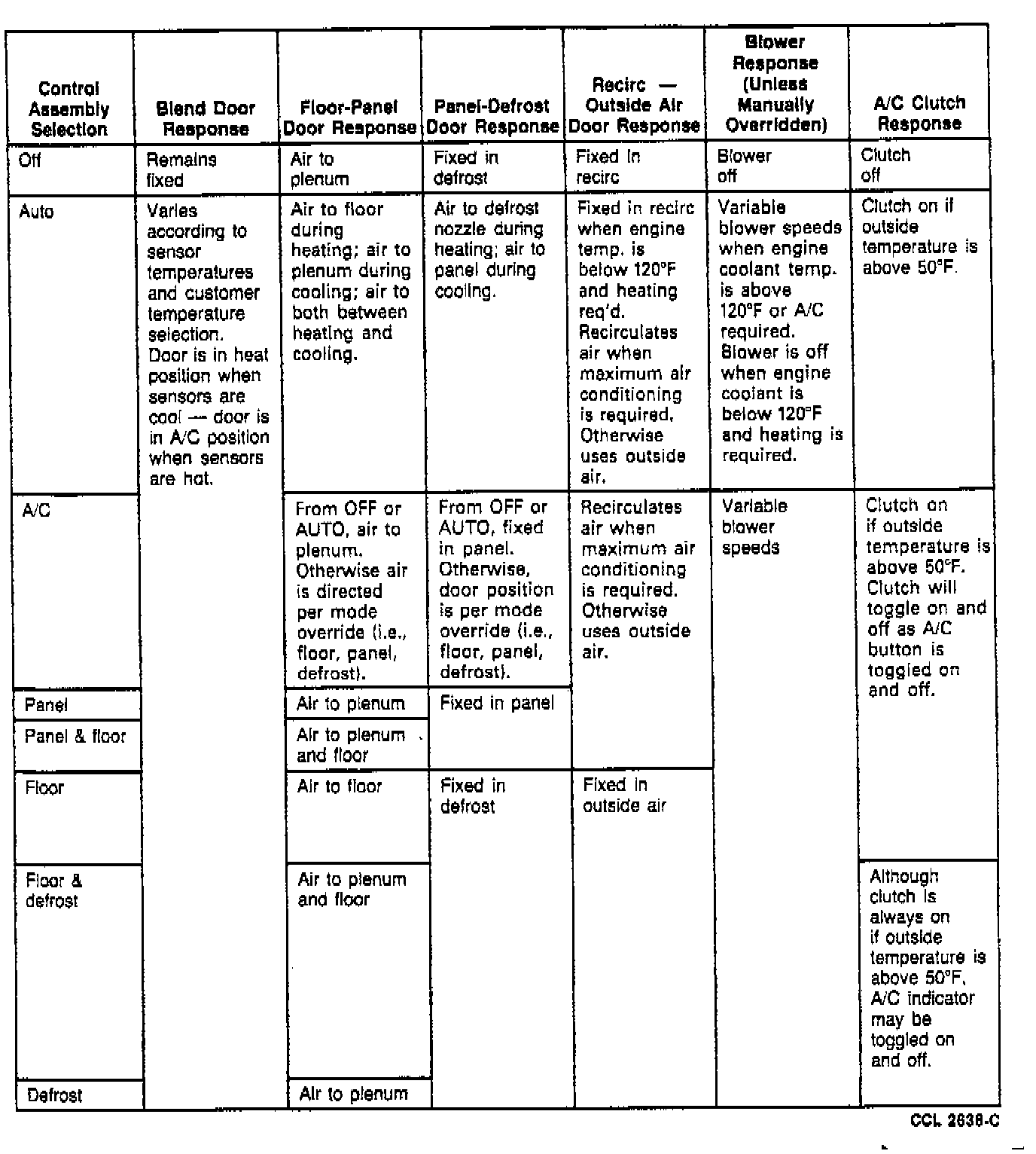A small DC electric motor or actuator is used to operate the temperature blend door. Vacuum actuators are used to control each of the three remaining air distribution doors. A feedback circuit is used in the blend door actuator to supply the control assembly with blend door position information. The blower motor is controlled by the control assembly through the blower speed controller. The blower speed controller is necessary to react to the low power signal from the control assembly to provide high power signal required to drive the blower. The System Response Chart shows the control assembly response to the function selections.