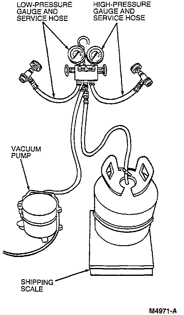 5. When no more refrigerant is being drawn into the system, start the engine and select an A/C function on the control assembly. Select the highest blower speed and allow the remaining refrigerant to be drawn into the system. Continue to add refrigerant into the system until the specified weight of R-134a has been added. Then, close the charging cylinder valve and allow the system to pull any remaining refrigerant from the hose. When the suction pressure drops to approximately 207 kPa (30 psi), close the gauge set center hose valve.