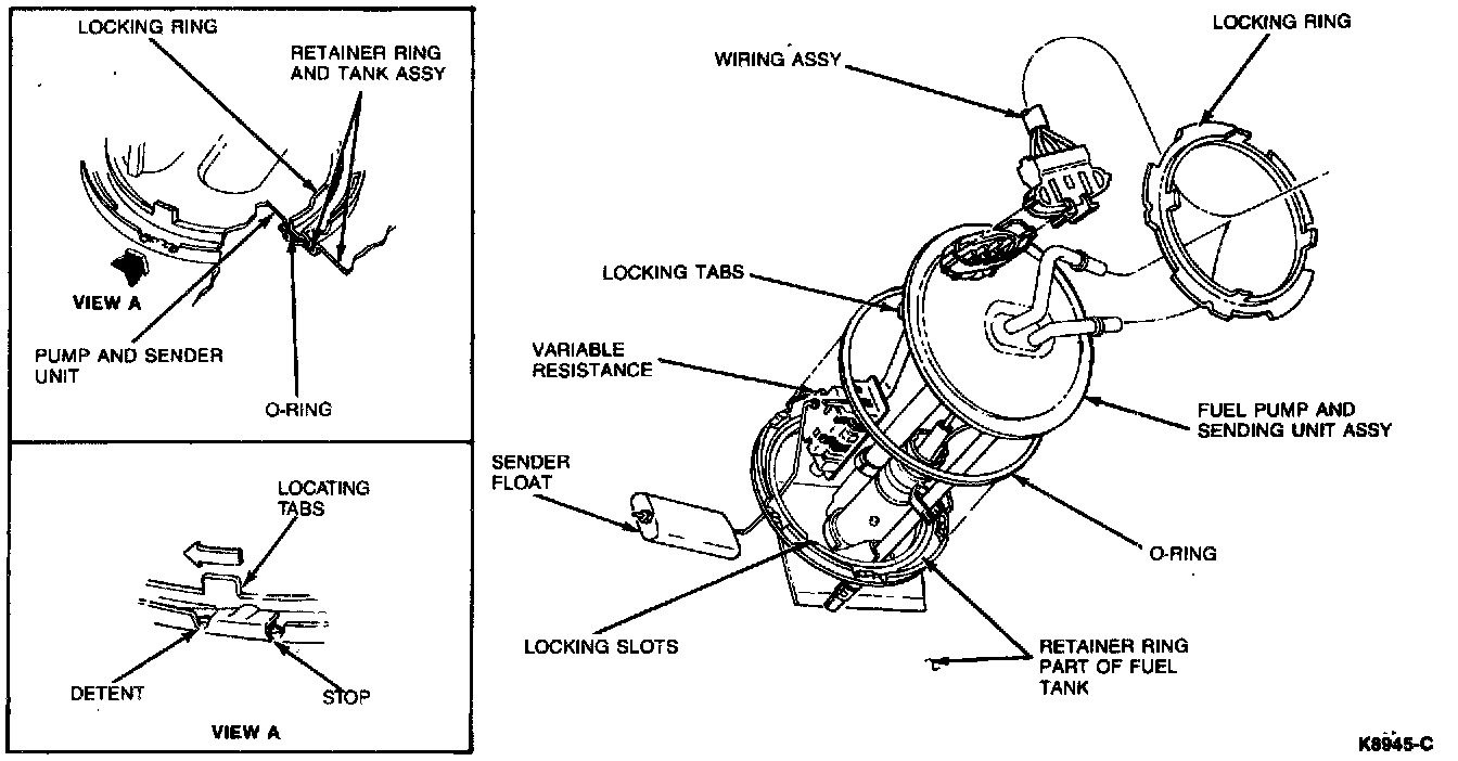 7. Turn locking ring counterclockwise using Fuel Tank Sender Wrench T86T-9275-A or equivalent. Remove locking ring, pump and sending unit assembly.