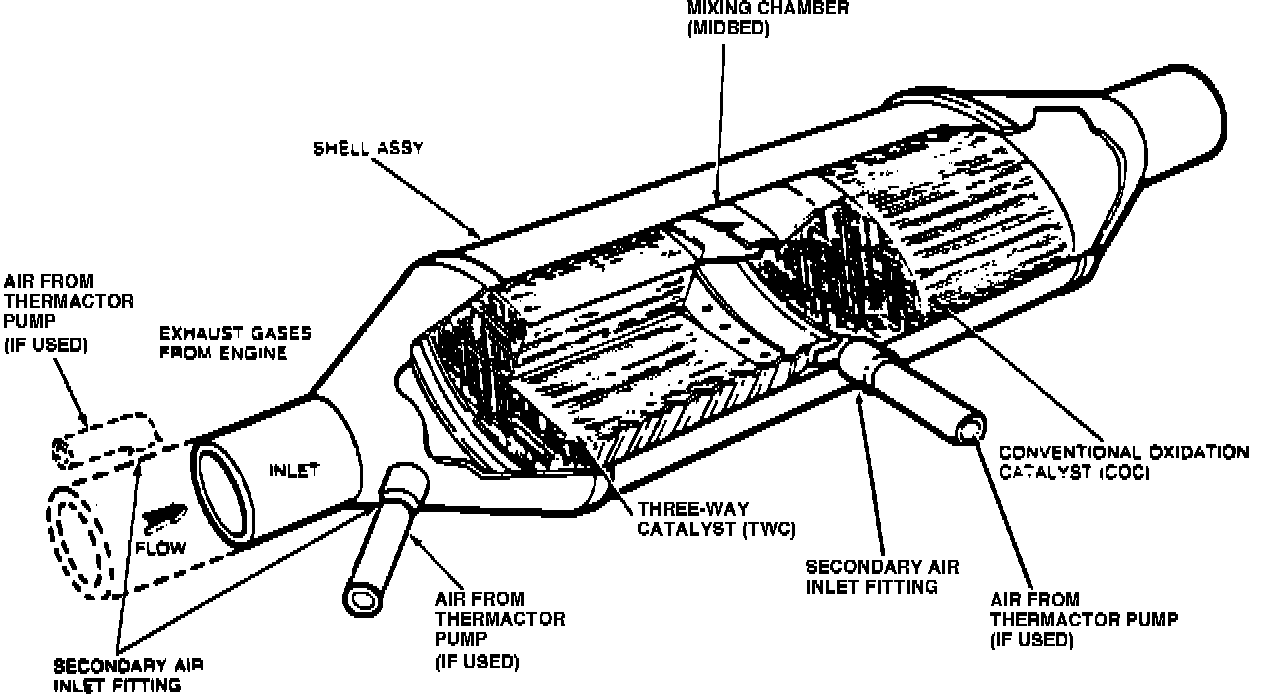 The Three-Way Catalytic Converter (TWC) is designed to reduce all three exhaust pollutants, but works best to reduce NOx when the CO level of the exhaust is between 0.8 and 1.5 percent. As the CO level increases or decreases from that percentage, the TWC converters efficiency decreases. Exhaust gas first passes through the catalyst, where NOx is reduced to N2 and CO2; then through the catalyst where HC and CO are changed to H2O and CO2.