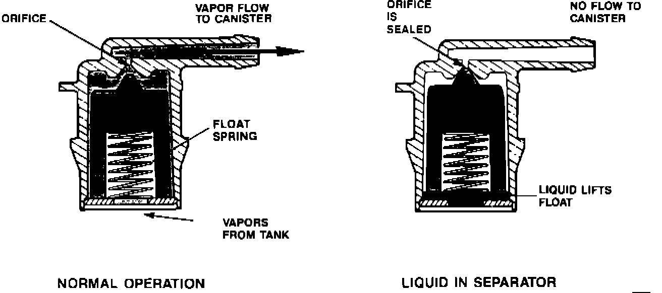 If liquid fuel should enter the valve assembly, the float will rise upward and close the orifice. As the fuel is drained back into the fuel tank, the spring attached to the underside of the valve pulls the float downward, exposing the orifice.