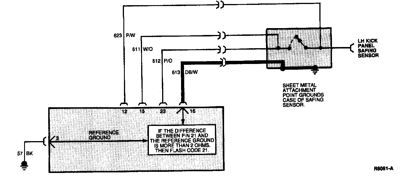 The diagnostic monitor measures the resistance between Pin 16 (Circuit 613, DB/W) and Pin 3 (diagnostic monitor reference ground). If the diagnostic monitor measures a difference of more than 2.0 ohms between Pin 16 and Pin 3, it will flash out code 21 on the air bag indicator.