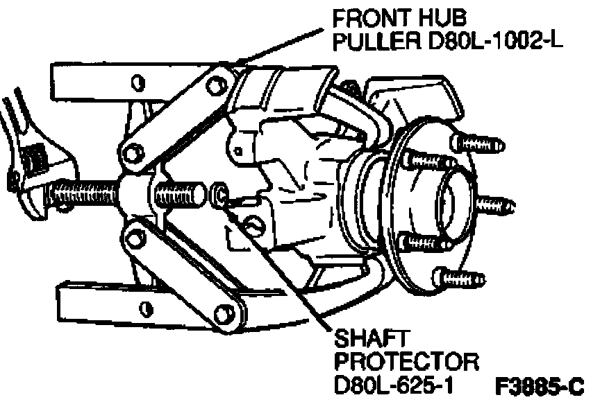 14. On the bench, install Front Hub Puller D80L-1002-L and Shaft Protector D80L-625-1 or equivalent, with jaws of puller on knuckle bosses and remove hub.