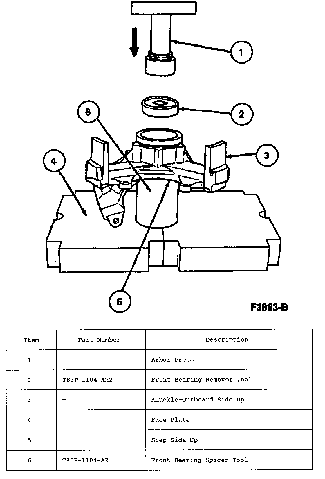 2. Place Front Bearing Spacer T86P-1104-A2 or equivalent step side down on hydraulic press plate and position knuckle (outboard side down) on spacer. Position a new bearing in inboard side of knuckle. Install Bearing Installer T86P-1104-A3 or equivalent (undercut side facing bearing), on bearing outer race and press bearing into knuckle. Ensure that bearing seats completely against shoulder of knuckle bore.