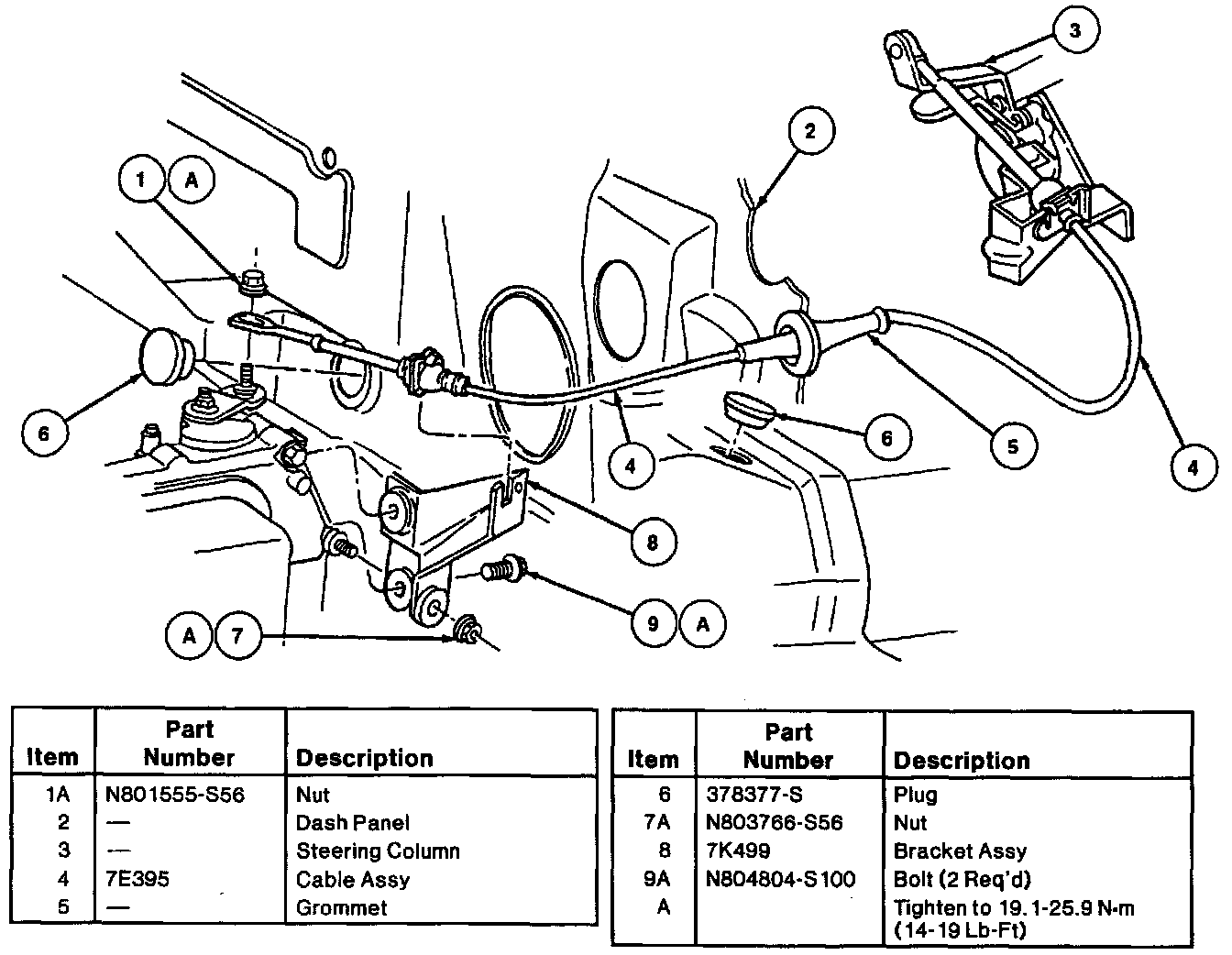 1. From under the instrument panel, remove the shift control cable and retaining bracket from the steering column.