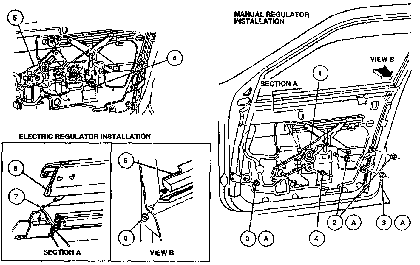 6. Remove front door window regulator and front door window channel bracket assembly from front door.