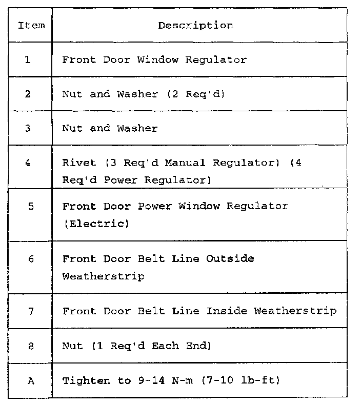 3. NOTE: Two 1/4-20 x 1-inch bolts and two 1/4-20 nut and washer assemblies may be used as alternates for front door window glass retention. However, torque must not exceed 4-7 N-m (3-5 lb-ft). Equivalent metric retainers may be used.