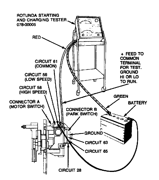 Disconnect the linkage from the motor and disconnect the electrical plug to test the motor on the vehicle. Connect the green lead from the test equipment, such as Rotunda Starting and Charging Tester 078-00005 or equivalent, to the battery positive (plus) post. Connect the positive (red) lead from the tester to the common brush terminal. Attach a ground first to the low-speed connection and then to the high-speed connection at the connector plug as shown. In either case, the current draw should not exceed 3.5 amperes.