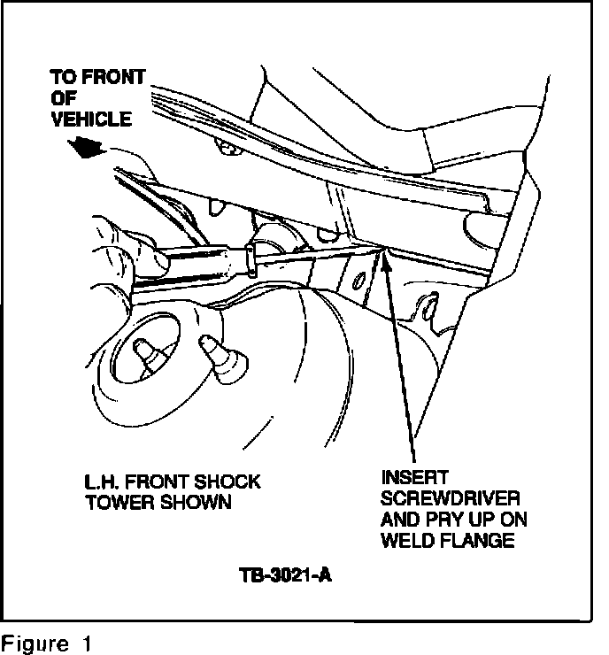 5. Move the wiring to the side to expose the weld flange behind the right hand and/or left hand shock tower, Figure 1.
