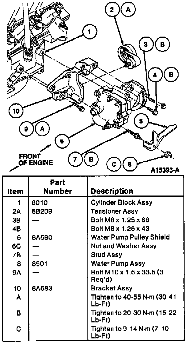 3. Install water pump inlet tube. Lubricate water pump end of tube with Silicon Lubricant COAZ-19553-AA (ESR-M-13P4-A) or equivalent before inserting into water pump. Install retaining nut to water pump inlet tube bracket and stud bolt and tighten to 7 N-m (7-10 lb-ft). Install lower tube bracket retaining bolt and tighten to 8-13 N-m (71-106 lb-ft).