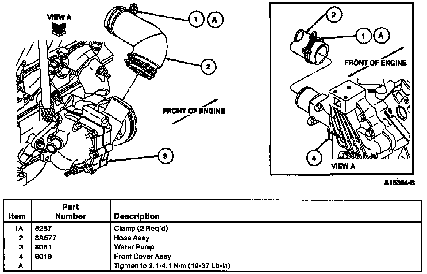 6. Install heater hose to front cover hose. Tighten hose clamp to 2.3-3.4 N-m (20-30-lb-in).