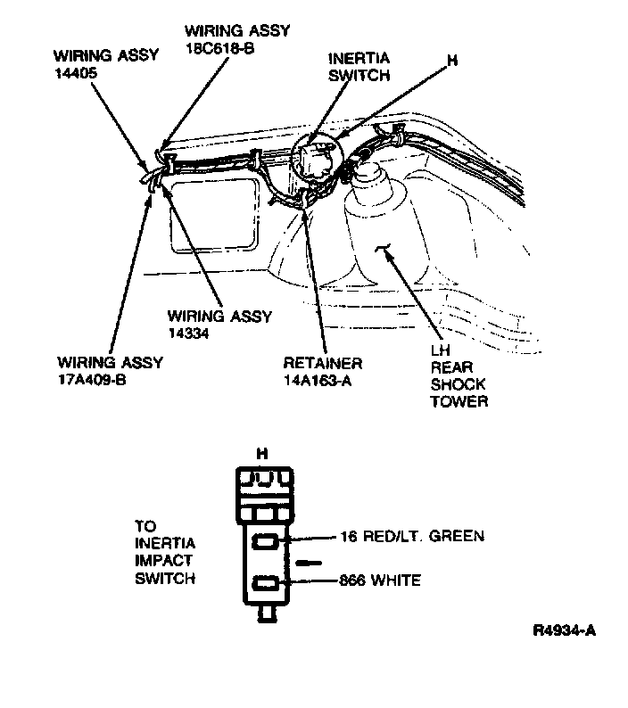 The connector for the inertia fuel shutoff switch is part of the 14405 wiring assembly and is located in the LH side of the luggage compartment. The circuits are connected to the 14401 wiring assembly in the LH cowl area by a 12-pin connector.