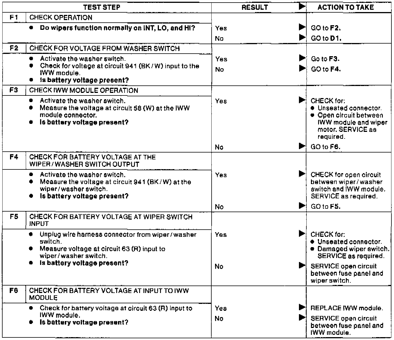 Fig. 38 Diagnostic Pinpoint Test F, Wipers Do Not Wipe After Wash Switch Is Pulled. Thunderbird/Cougar, Mustang, Tempo/Topaz: