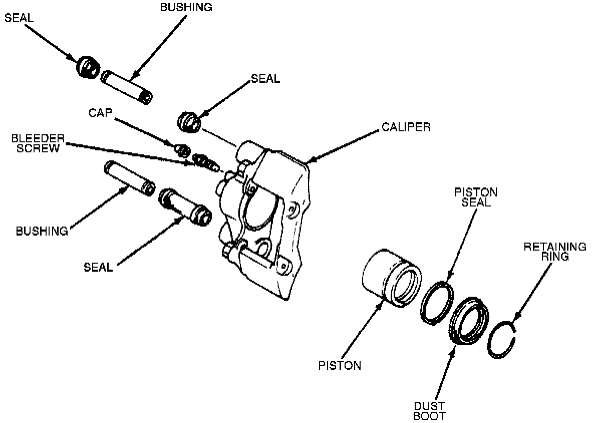 4. Inspect caliper bushings for corrosion and dust boot retaining ring for damage or tension loss. Replace parts as necessary.
