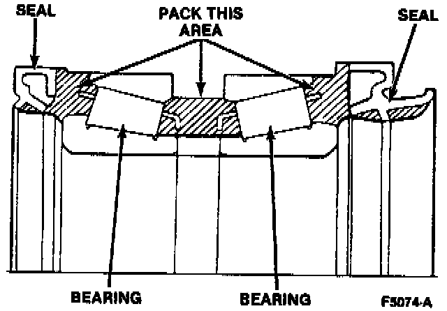 3. Pack the bearings and the hub area shown with Premium Long-Life Grease C1AZ-19590-E (ESA-M1C75-B) or equivalent.
