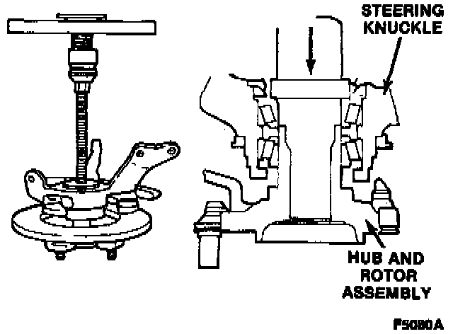 11. Install the hub and rotor assembly in the steering knuckle using a hydraulic press and suitable fixtures.