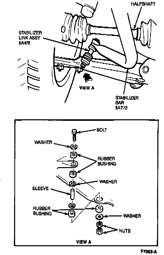 5. Remove the stabilizer bar to control arm attaching bolt, nut, washers and bushings.