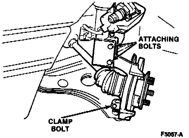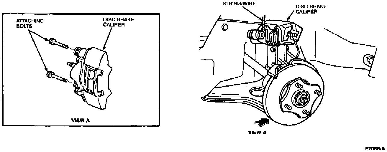 10. Remove the brake caliper retaining bolts. Lift caliper off the rotor and suspend it from the suspension coil spring.