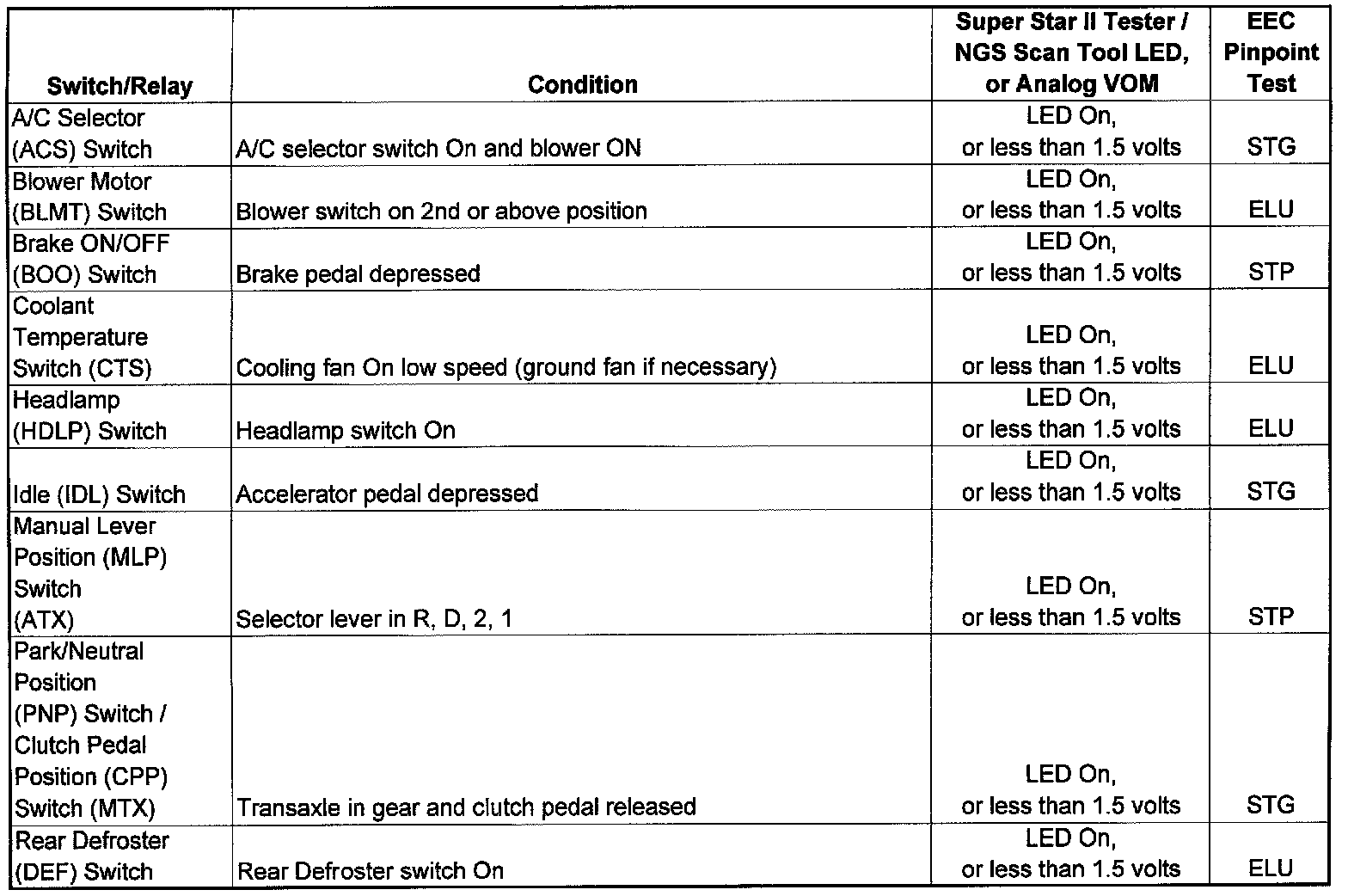 NOTE: Test all switches individually. Leaving a switch ON while testing another will lead to a false test result.1. Turn engine OFF, and allow to cool.