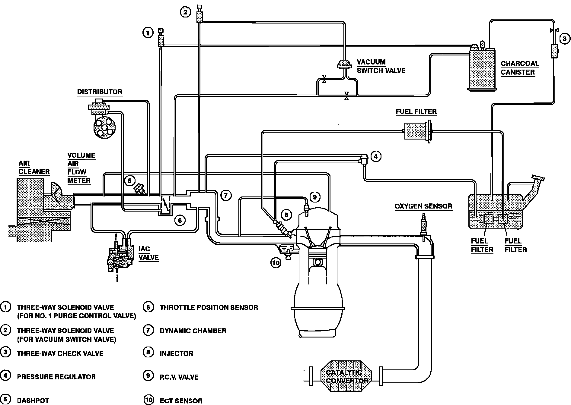 This was one of the first emission control systems. Rather than being vented to atmosphere, crankcase fumes are routed back through the intake system and reburned. Basic systems consist of necessary hoses and a Positive Crankcase Ventilation (PCV) valve to regulate fume flow through the system.