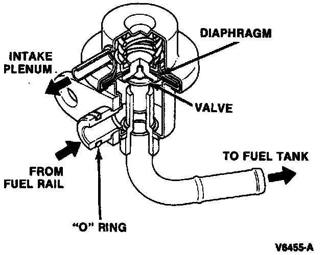 The pressure regulator is mounted to the return line end of the fuel rail, it controls the fuel flow back to the Fuel tank, keeping the pressure of the Fuel Rail in a desired range. When intake manifold vacuum is low (fuel demand high) spring pressure inside the regulator causes the valve to partially close which will increase fuel pressure in the fuel rail. When intake manifold vacuum is high (fuel demand low) vacuum acting on the diaphragm compresses the spring, opening the valve further. Return fuel flow increases resulting in lower fuel pressure in the fuel rail. For testing see Fuel System/ Testing And Inspection
